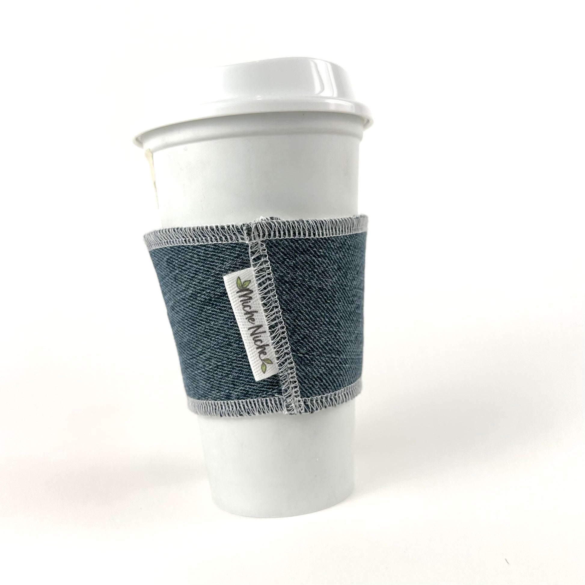 This coffee cup sleeve features upcycled denim, cotton, and batting.